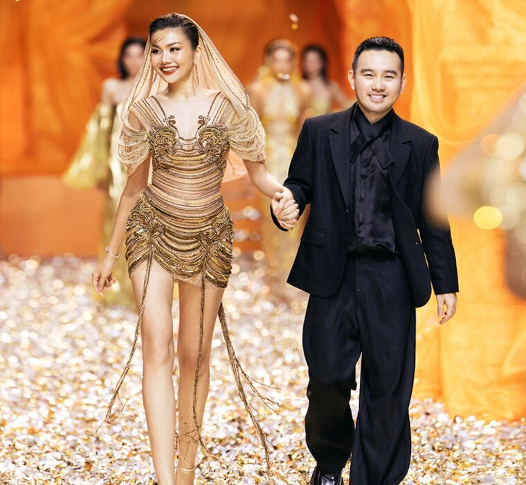 Golden Heritage of the fashion designer Le Thanh Hoa is inspired by the design of Cham Pa sculpture techniques with diverse but mainly featuring silhouettes from mermaid dresses, jumpsuits, A-line dresses, to mini dresses…